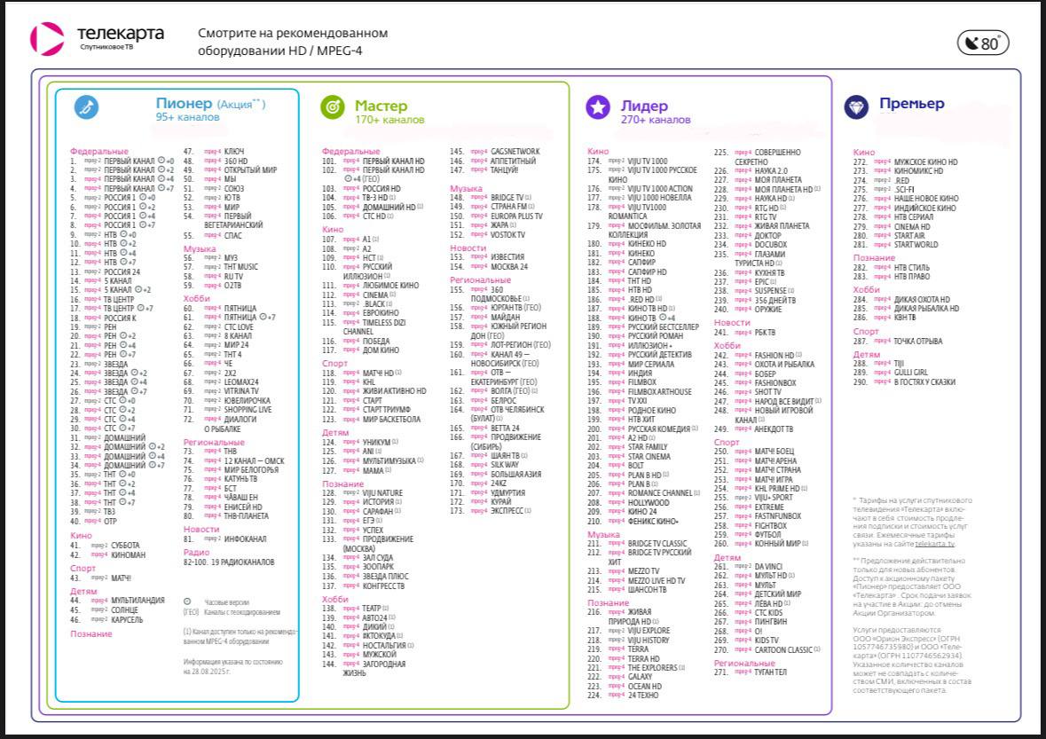 Ниже представлена примерная таблица каналов в тарифах Телекарты Пионер, Мастер, Лидер и Премьер. Состав пакетов может обновляться, поэтому точный список лучше уточнять по ID в чате WhatsApp.